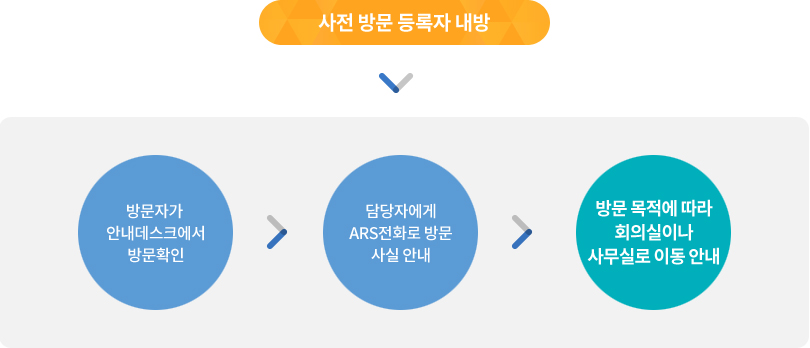 하루에도 몇 번 씩 찾아오는 방문객들을 일일이 대응하는 것은 업무 효율성을 저해하는 한 요소입니다. 사전에 방문 등록을 진행한 사람이 내방을 하면, ARS로 담당자에게 알려주어 방문객을 회의실이나 사무실 등으로 자동으로 안내해주는 서비스입니다.