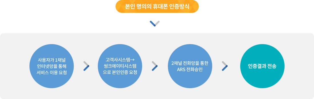 서비스 요청 채널(인터넷)과 다른 채널(휴대폰)으로 본인 여부를 확인하는 2채널(2트랙) 인증 방식으로본인 명의의 휴대폰으로 전화를 걸어 ARS 안내에 따라 본인이 직접 승인하는 방식의 전화승인서비스입니다.